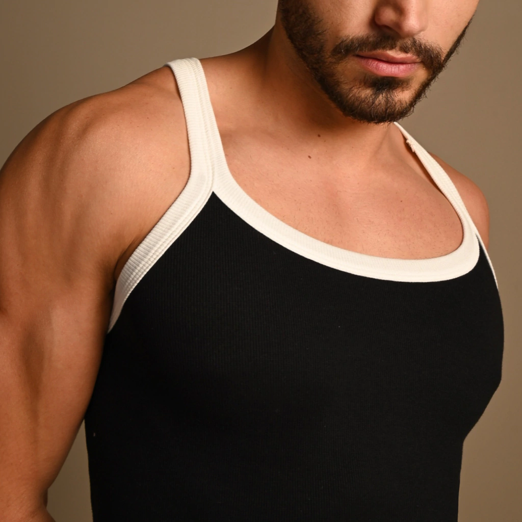 A Line Duo Black reinventa o clássico preto com contraste de alças Off-White. Minimalista, versátil e imponente, é aquela peça que combina impacto visual com caimento impecável. As alças finas alongadas e o decote mais profundo realçam o peitoral de forma natural, enquanto a malha canelada premium garante conforto e estilo em qualquer ocasião.